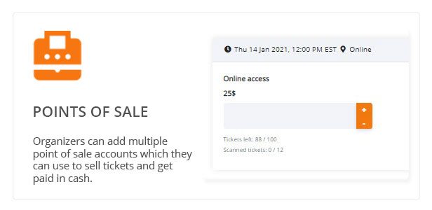 Point of sale accounts are added by the organizers and are affected to one or more event date. Their log in with their credentials and sell tickets and get paid in cash.